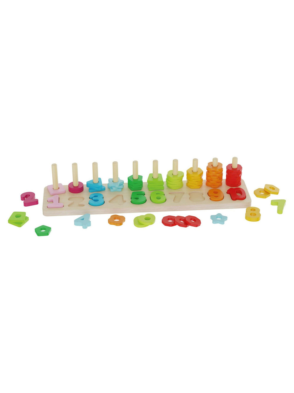 Number game,It helps children with counting,66-piece set,Numbers 1-10,1 base mat with 10 colored numbers and a total of 55 differently shaped sorting plates,With a stable wooden base,Suitable for children: from 1 year